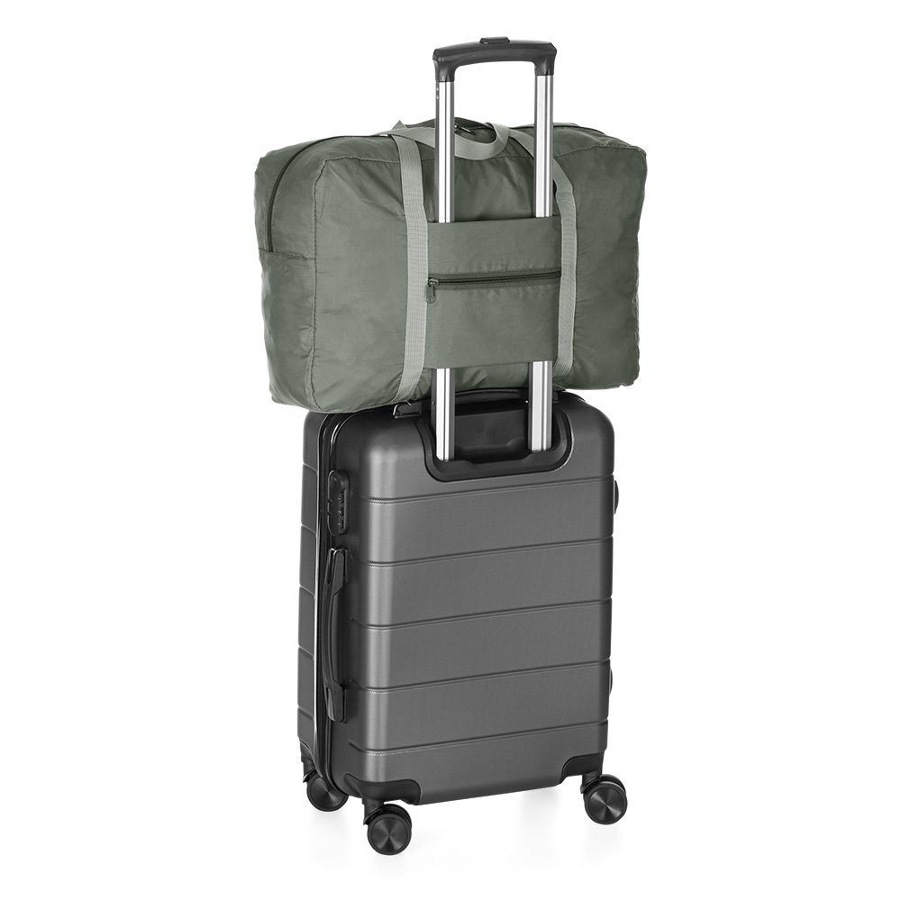 Bolsa de viagem dobrável 32 litros em poliéster impermeável com dois compartimentos. Contém bolso para encaixe em malas de viagem.