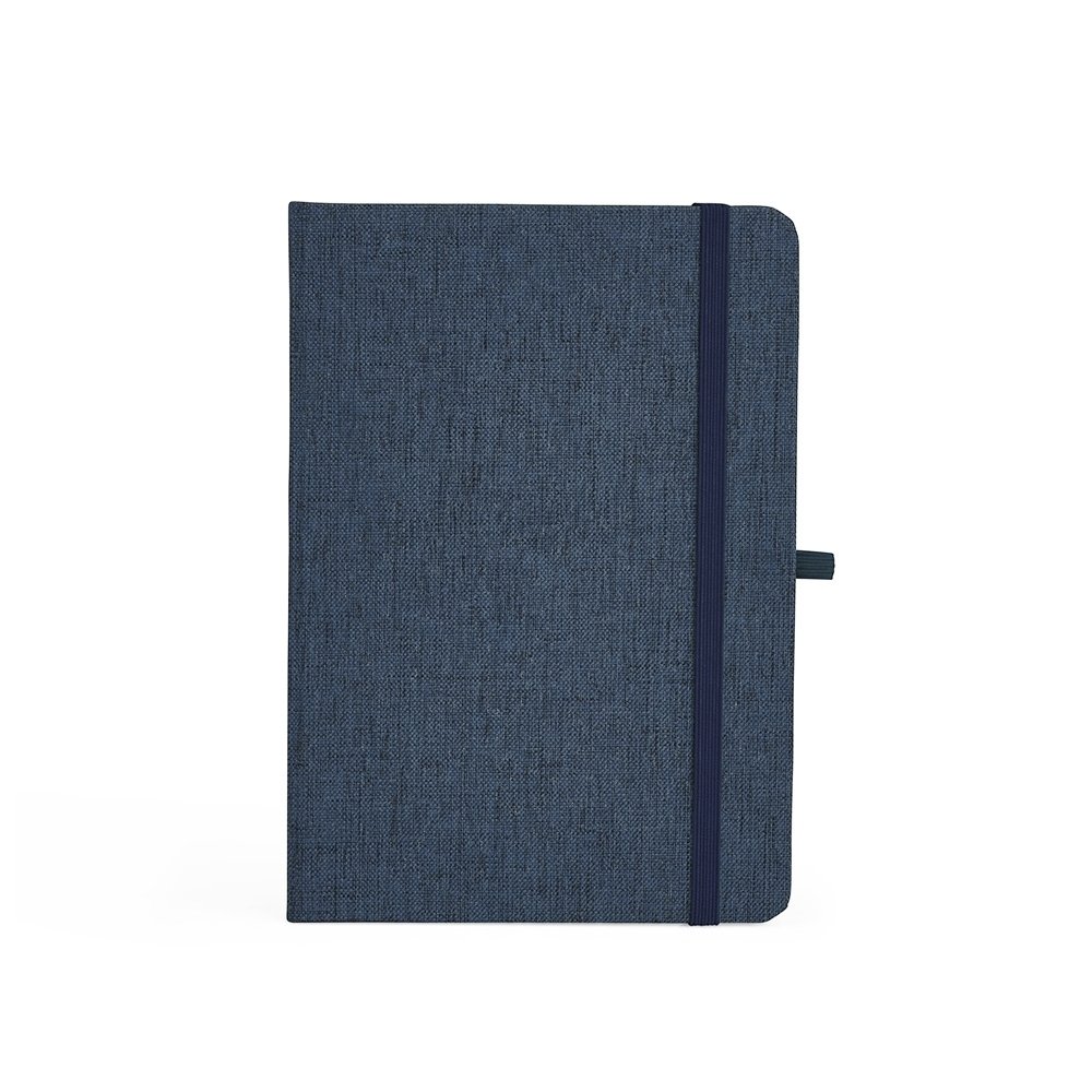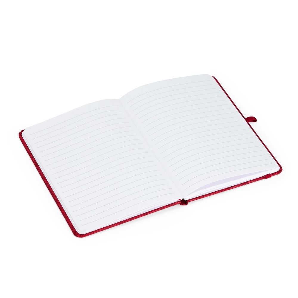 Caderneta feita de linho com porta caneta elástico, marcador de página em cetim e fita elástica para fechar. Contém aproximadamente 80 folhas brancas pautadas.