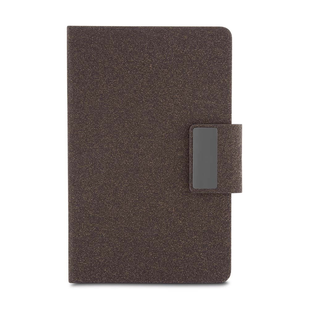 Caderneta com capa em PU revestida com fibra de café ou chá, engate para caneta com fecho magnético e placa metálica, marcador de páginas em fita de cetim e cerca de 80 folhas pautadas.
