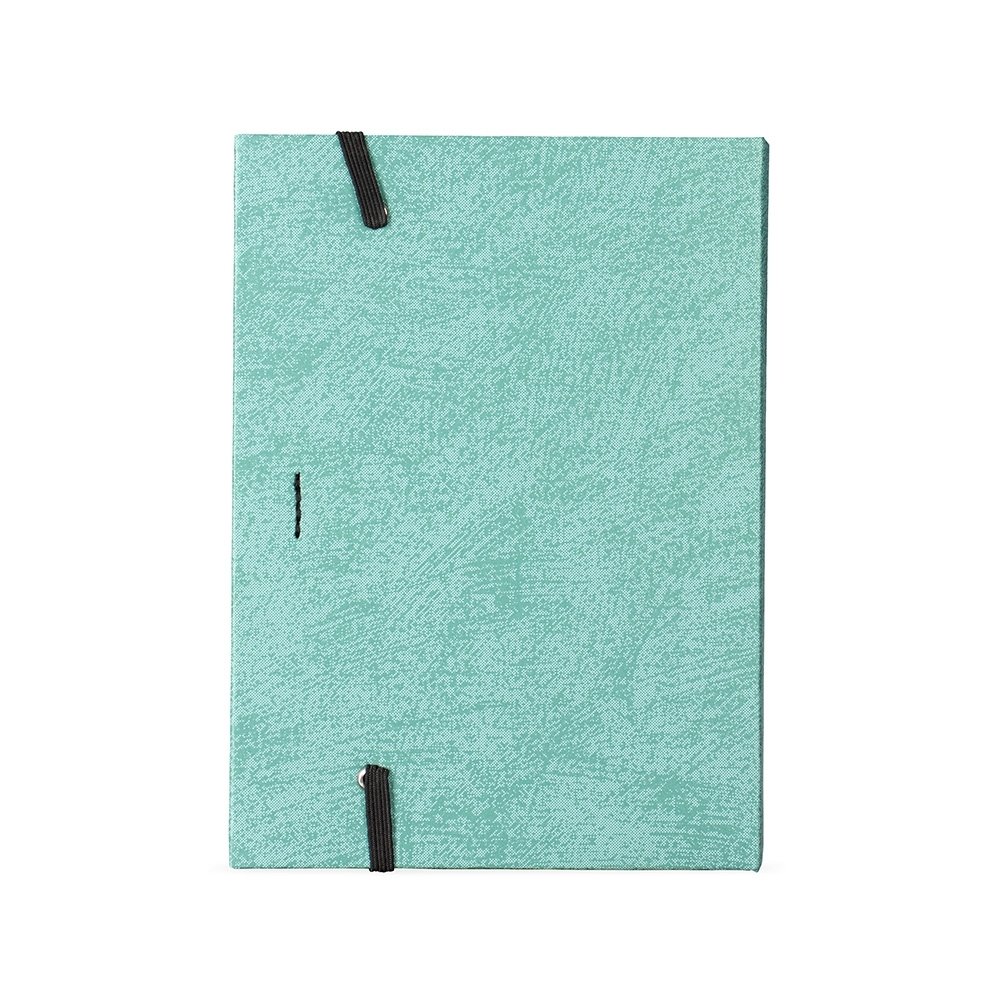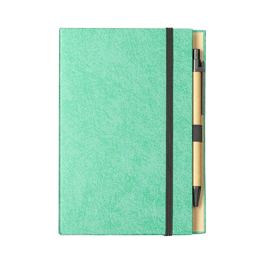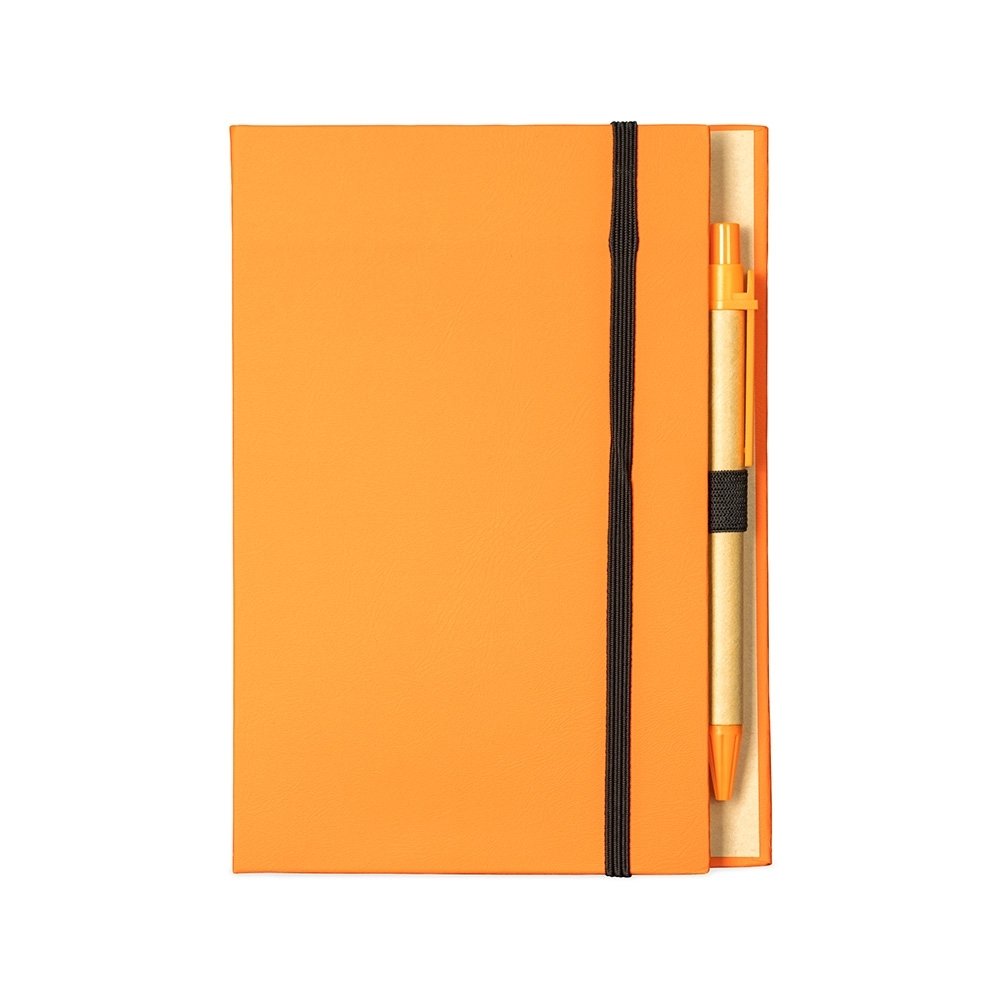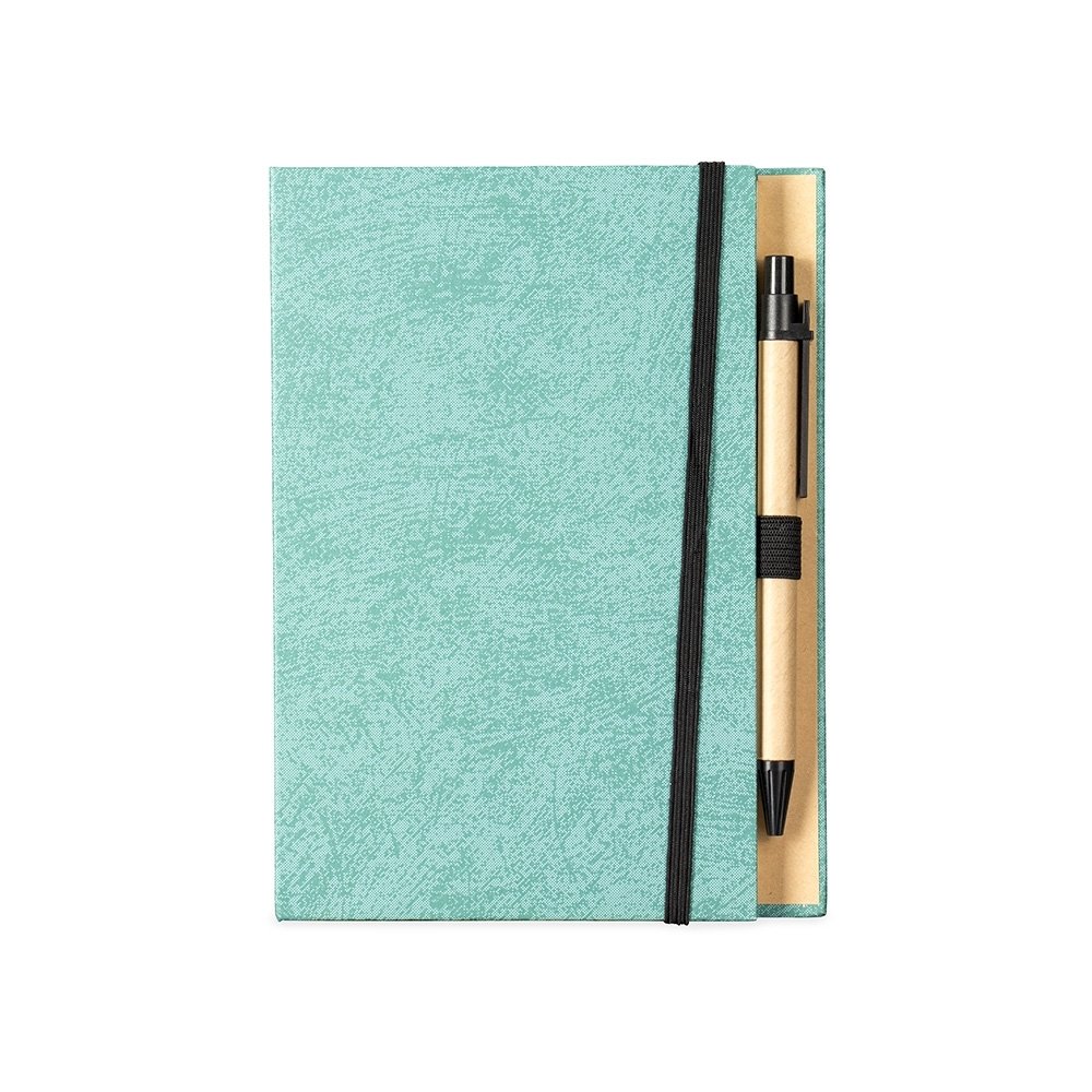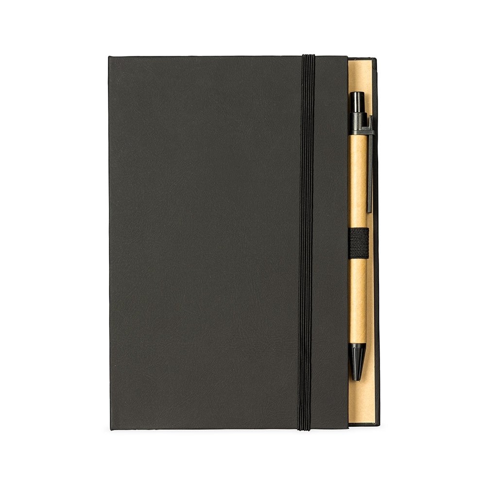 Bloco de anotações com capa dura revestida em papel especial e fita elástica para fechamento. Possui cerca de 80 folhas pautadas, além de um bloco com aproximadamente 20 folhas autoadesivas amarelas e por volta de 100 marcadores de página autoadesivos, divididos em cinco cores diferentes. Acompanha uma caneta esferográfica com carga azul de 1.0mm e acionamento por clique, corpo em papelão e demais componentes em plástico.