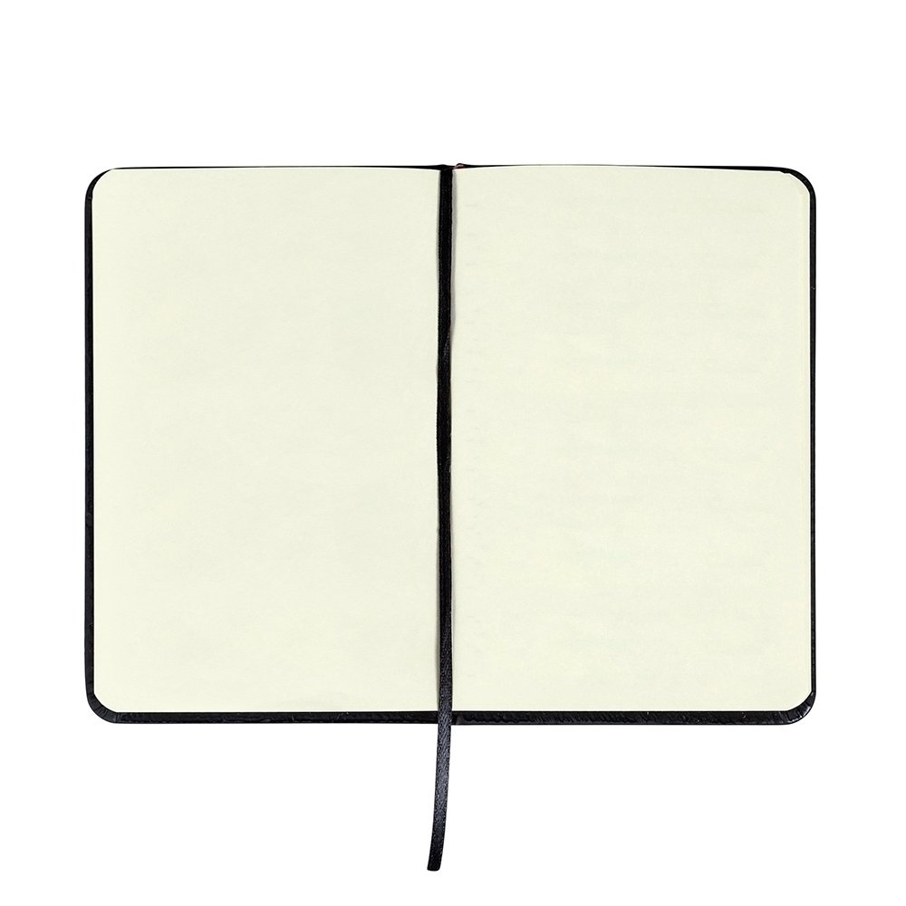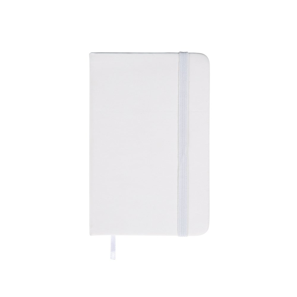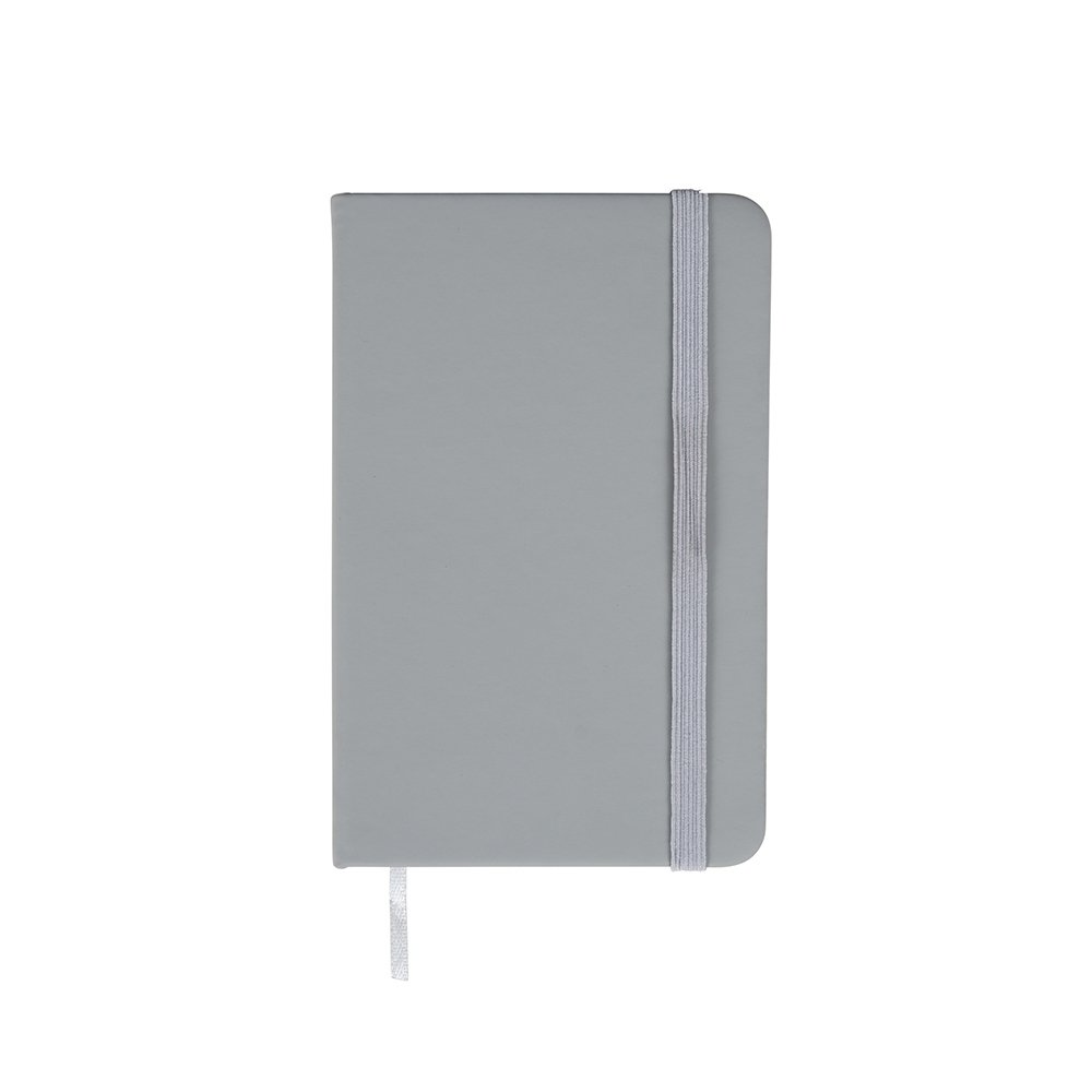 Caderneta com capa emborrachada, marca-páginas em fita de cetim e fechamento em elástico. Possui aproximadamente 80 folhas pardas não pautadas.