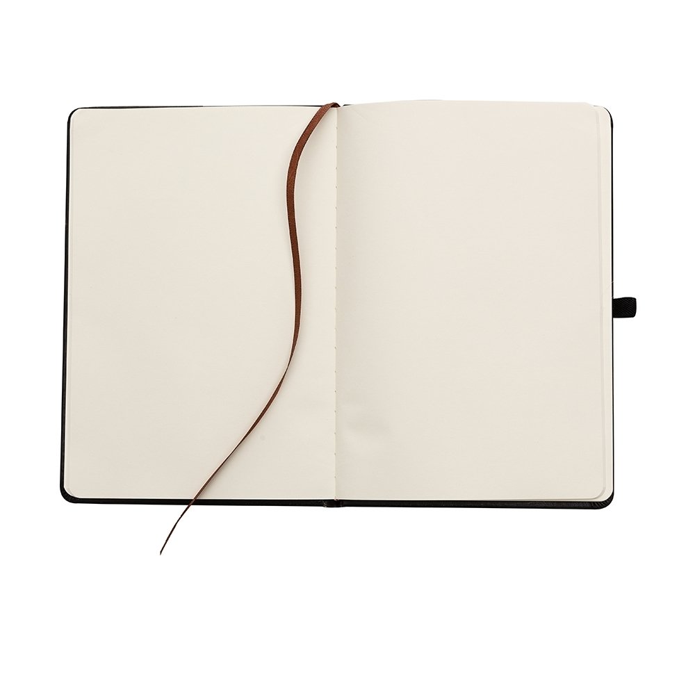 Caderneta emborrachada com suporte para caneta. Contém aproximadamente 96 folhas amarelas sem pauta, suporte de nylon para caneta (não acompanha), marcador de página em cetim e elástico para lacre com plaquinha de centro emborrachado.