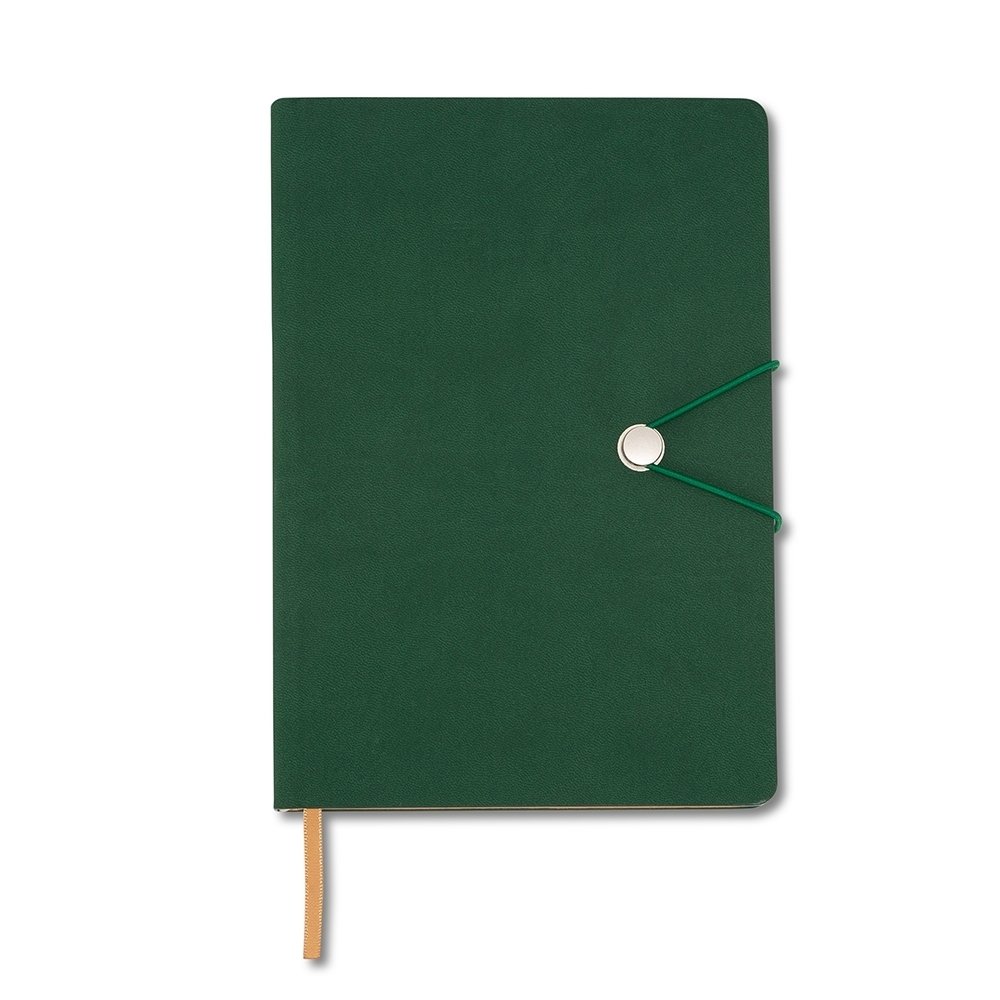 Caderneta com fecho de pino e elástico de nylon para lacre. Capa em material sintético emborrachado, possui aproximadamente 96 folhas pardas pautadas e marca página em cetim.