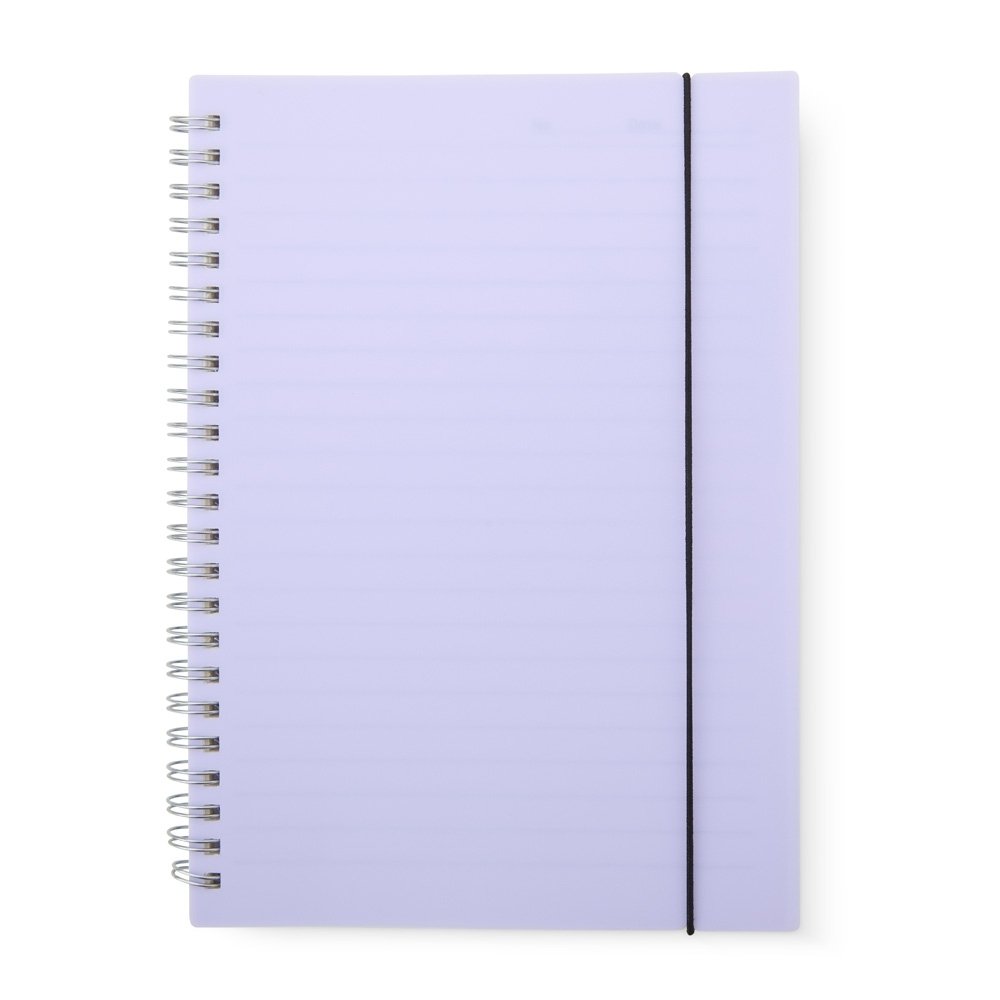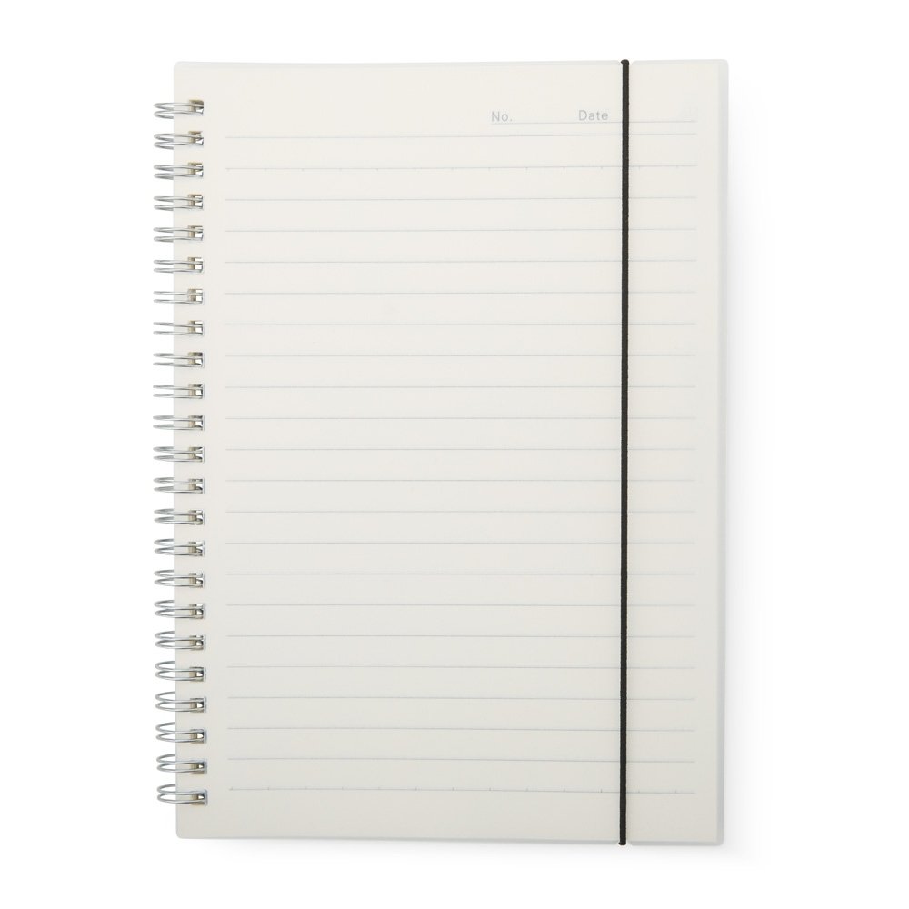 Caderno A5 com capa plástica e elástico para lacre, contém aproximadamente 80 folhas marfim com pauta.