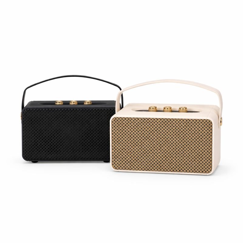 Caixa de som multimídia com design inspirado em amplificadores de guitarra. Possui construção em plástico ABS e metal, classificação IPX4 resistente a respingos d’água, painel superior de botões para controle, alça em couro sintético para transporte e pés com revestimento emborrachado. Oferece conectividade Bluetooth 5.1 e entrada para cabo auxiliar P2, além de cartão TF (MicroSD) e USB-A, permitindo a reprodução de arquivos MP3. Acompanha cabo USB-C para carregamento.