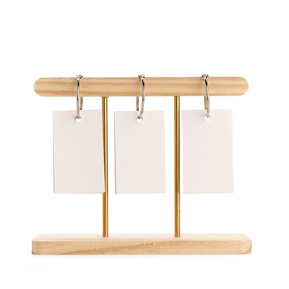Calendário permanente de mesa com estrutura em madeira e metal. Conta com fichas em papel cartão que exibem os dias e os meses, além de argolas metálicas para organizar as fichas e deixar a montagem intuitiva.