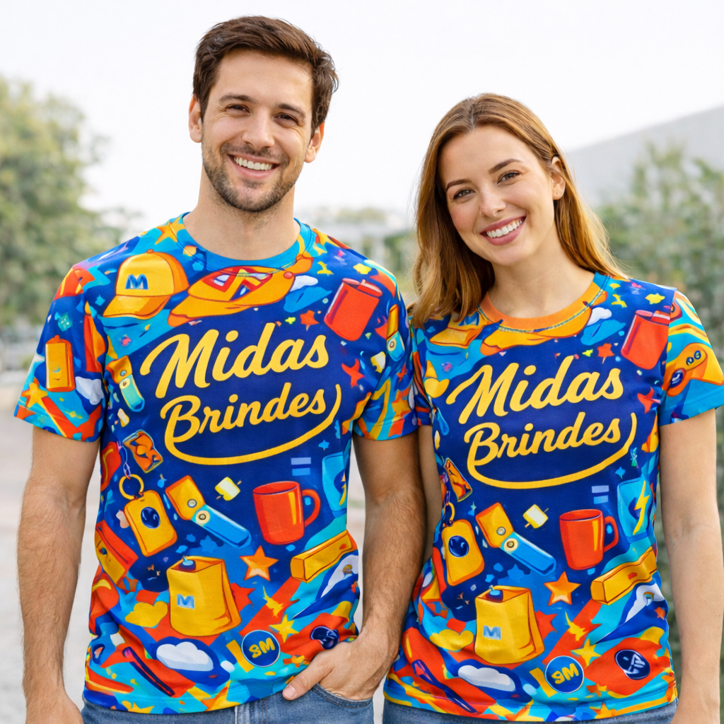Camiseta em poliéster personalizada com impressão colorida em sublimação total, sem limite de cores.