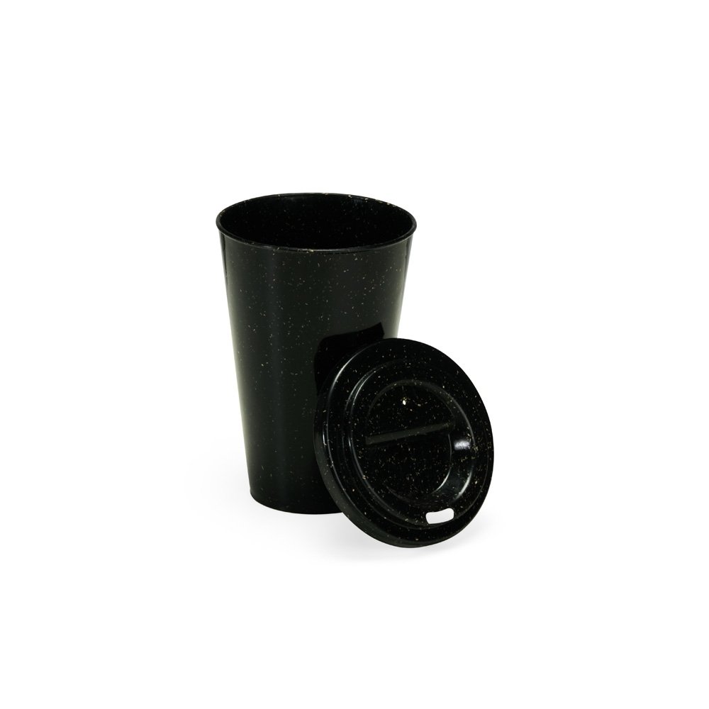 Copo feito em fibra de madeira com capacidade máxima de 450ml. Possui tampa com bocal.