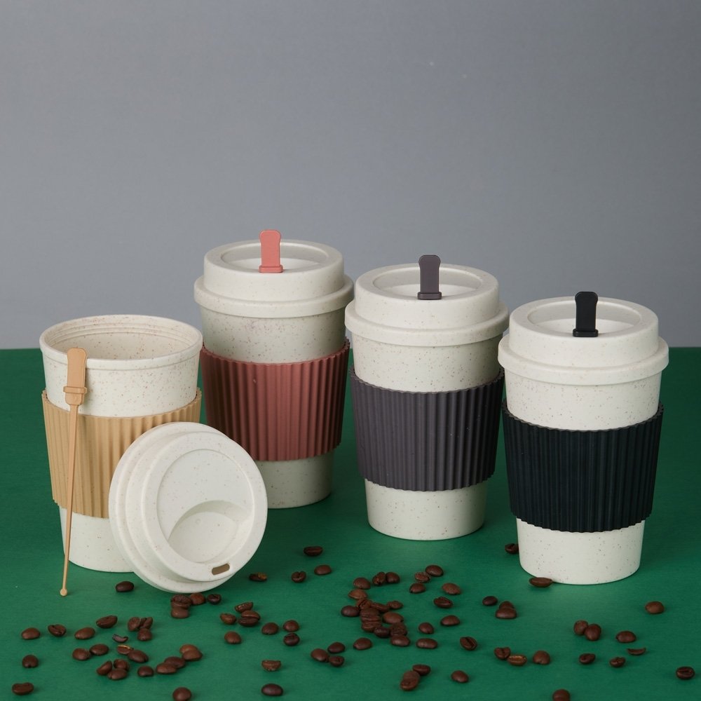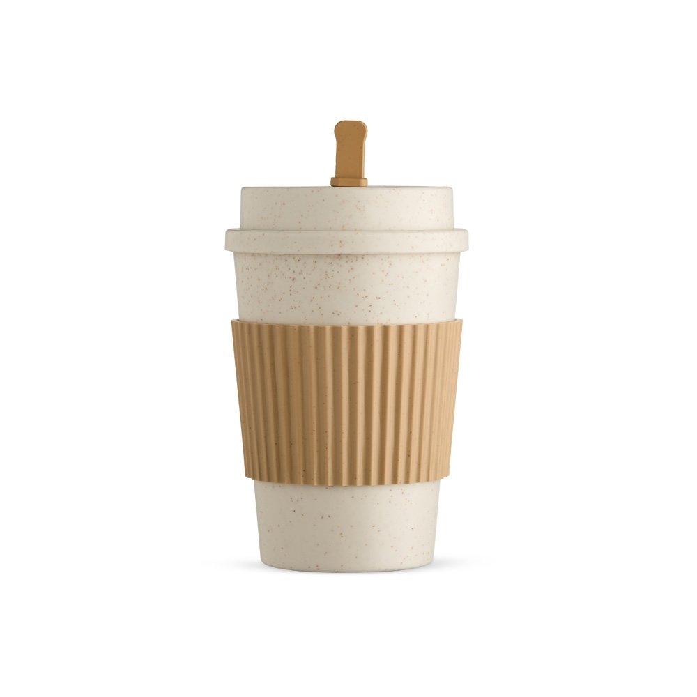 Copo em fibra de trigo livre de BPA, capacidade para até 450ml e tampa rosqueável com bocal. Acompanha mexedor e manga antiderrapante.
