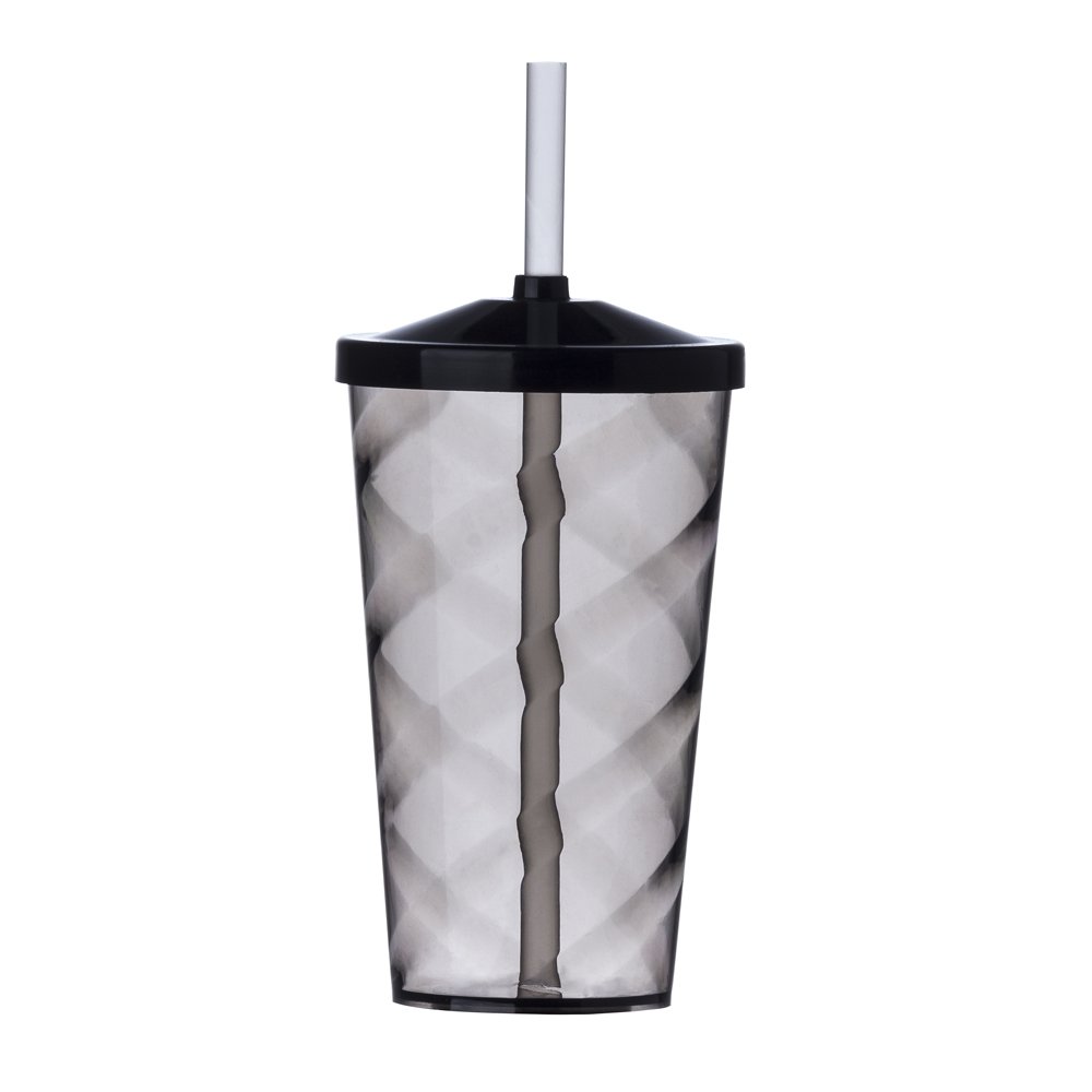 Copo em plástico poliestireno, com detalhes em espiral, tampa resistente e capacidade de até 550ml. Acompanha canudo de plástico biodegradável.