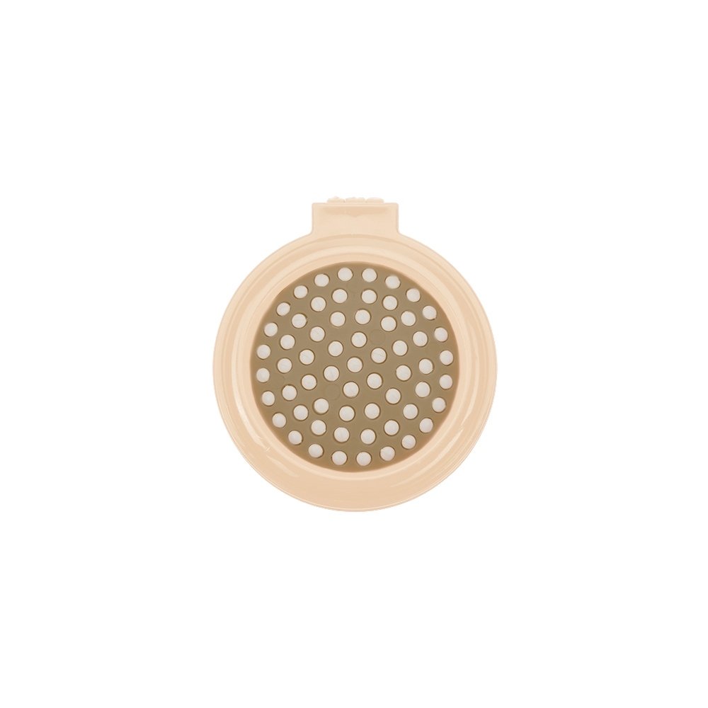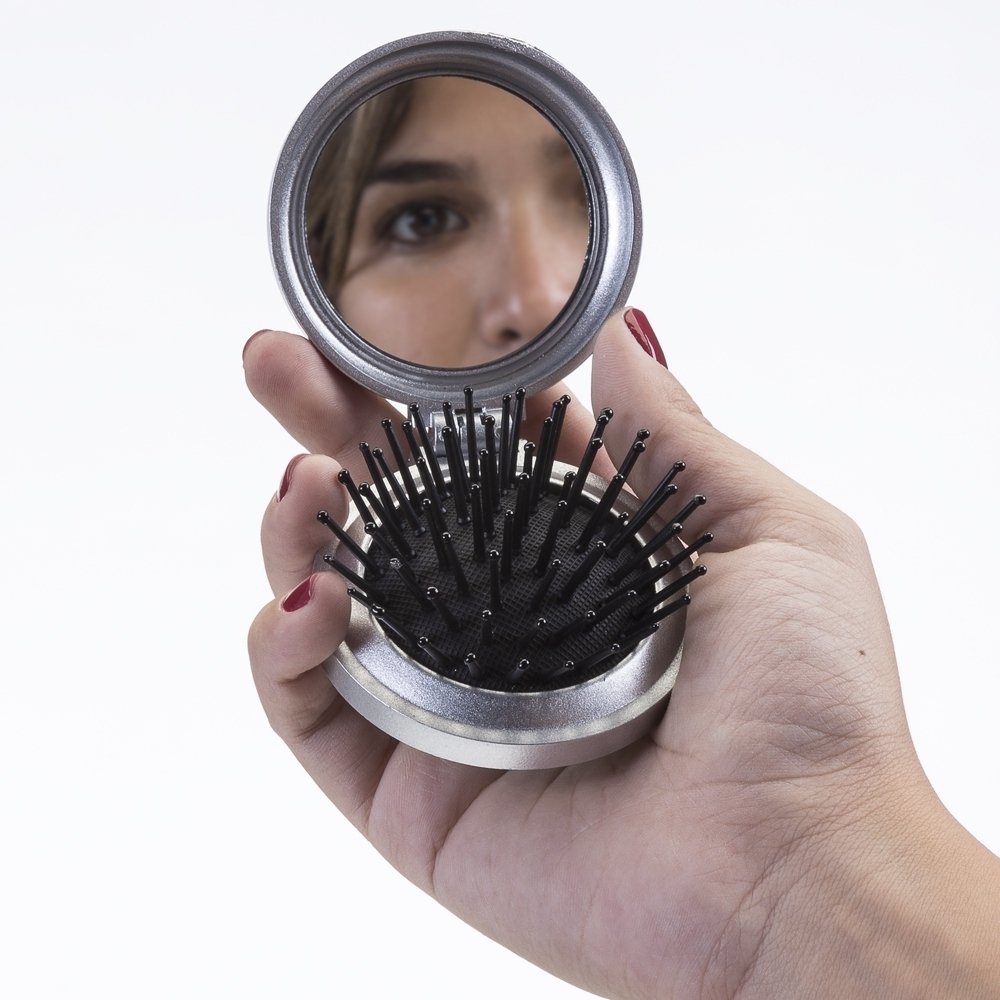 Escova com espelho redonda em plástico resistente. Parte superior plana e parte inferior emborracha com relevo, estando aberta a peça basta empurrar a parte emborrachada (lado de fora) para poder utilizar a escova.