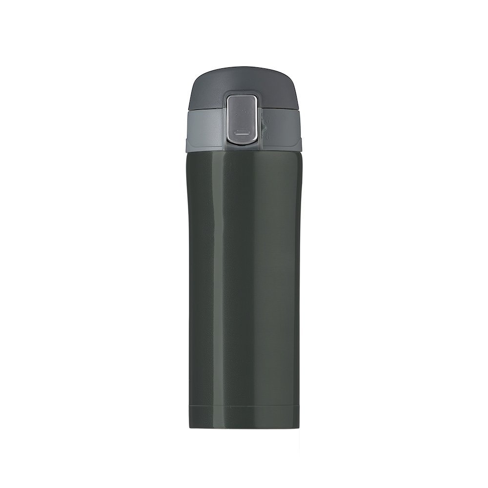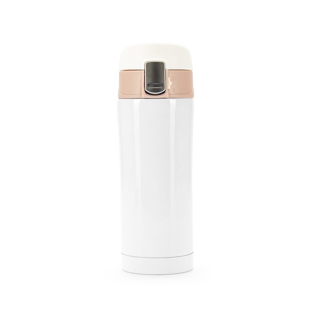 Garrafa térmica 320ml colorida com sistema de trava. Material metálico com revestimento interno em inox, possui tampa plástica fosca com borracha interna para vedação evitando o vazamento de líquido e prezando sua temperatura; possui botão central para abertura e trava lateral(basta seguir a orientação dos desenhos de cadeados simulando o travamento/destravamento da tampa).