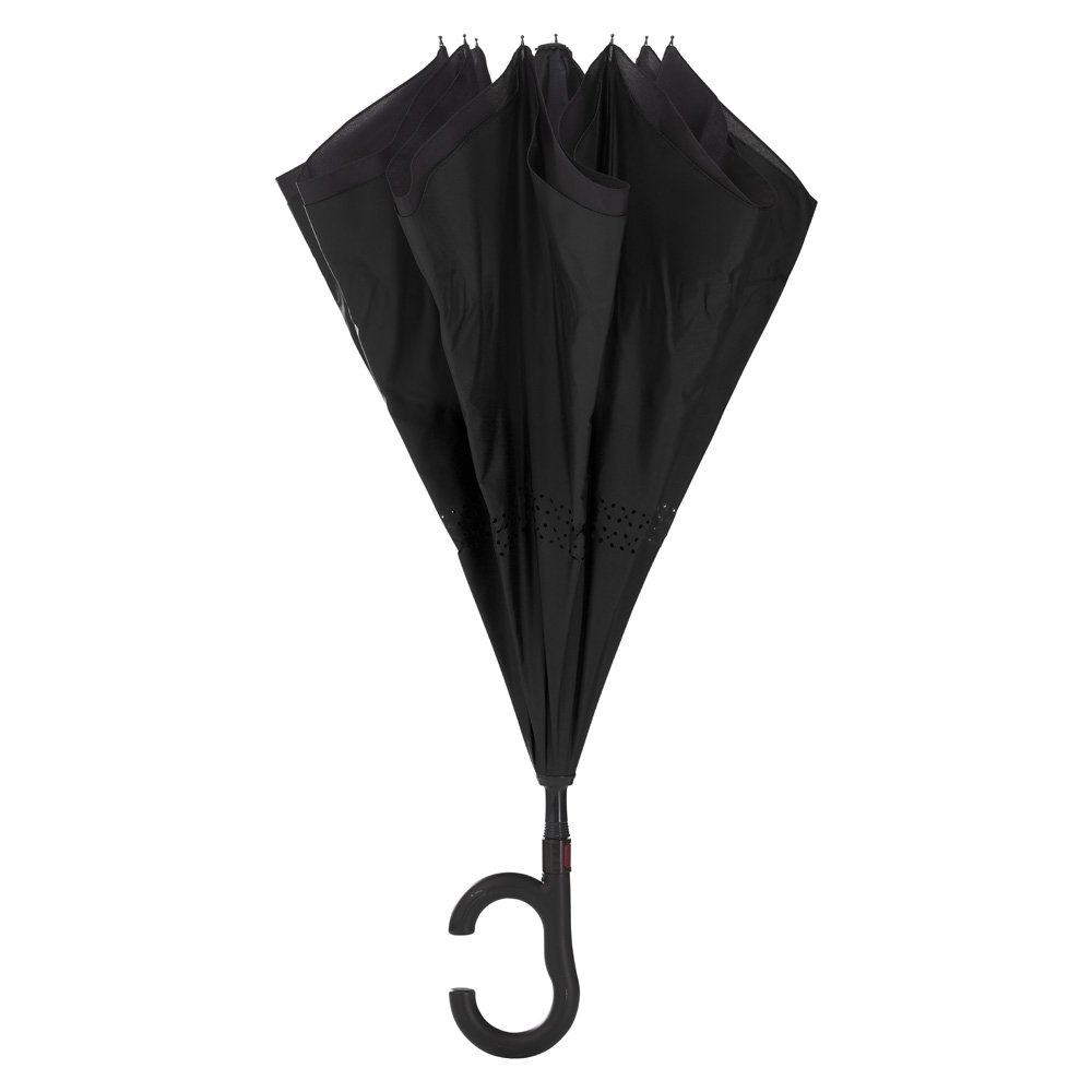Descrição: Guarda-chuva invertido com forro interno. Tecido ponge chinês e seda poliéster, possui um mecanismo inovador permitindo que o usuário não se molhe ao entrar e sair de ambientes devido sua abertura invertida, quando feito o movimento para fechar as varetas inverterão para cima criando um formato circular impedindo a chuva de atingir o usuário, podendo “segurar” a chuva enquanto entra/sai de um ambiente, ao virar o guarda-chuva a água irá escorrer. Forro interno para preservação das 8 varetas, evitando contato com a água e assim prolongando seu tempo de uso sem enferrujar. Ao impulsionar o fechamento invertido fica mais rápido e prático o modo de secar e ser guardado, pode ser apoiado no chão que permanecerá em pé para escorrer a água. Pegador plástico fosco em formato C, botão acionador vermelho e fita com velcro para lacre.