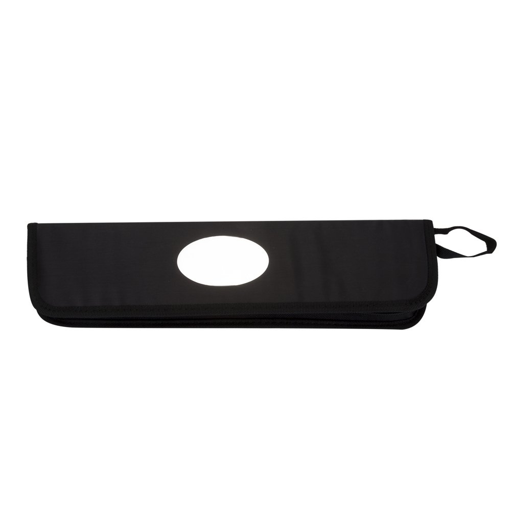 Kit churrasco formado por três itens em inox e detalhes em madeira: faca de 8 polegadas, um garfo de duas pontas e um pegador de alimentos, todos acomodados em um estojo em nylon com alça para transporte. Acompanha plaquinha adesiva personalizável.