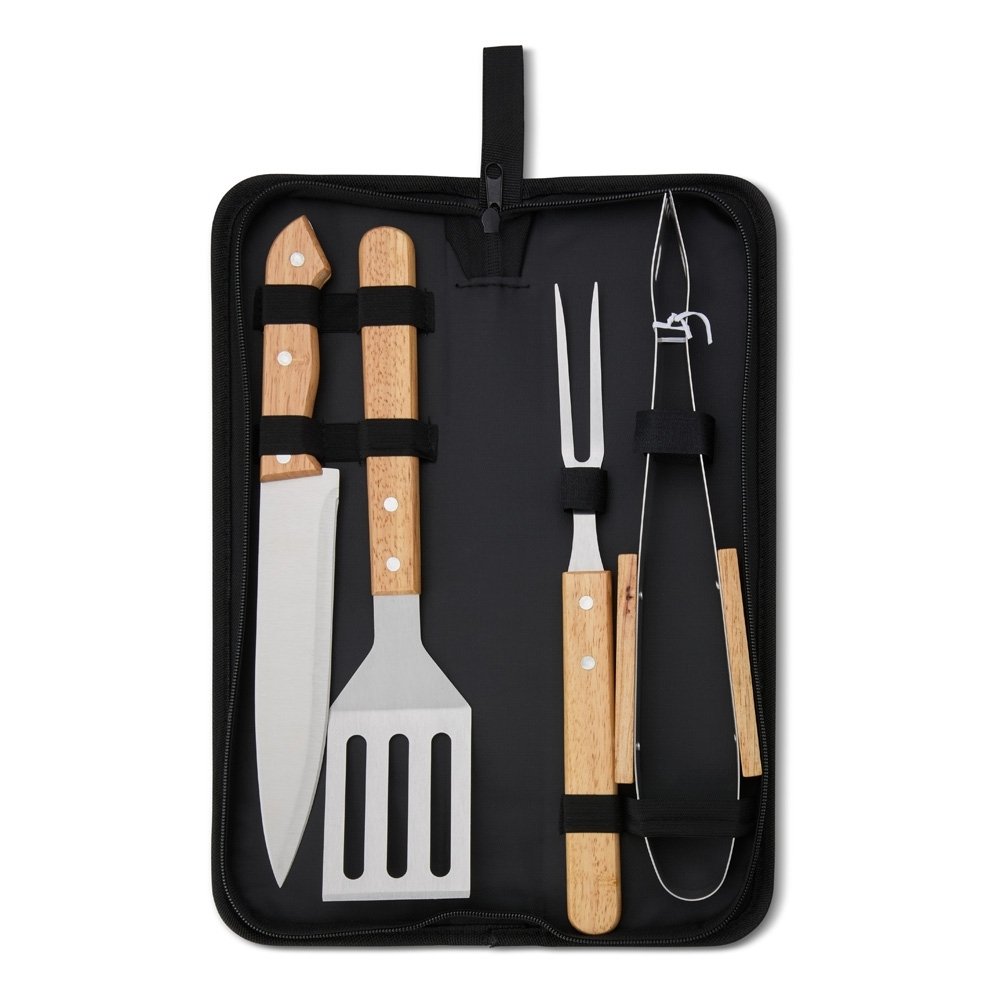 Kit churrasco 4 peças em estojo de nylon com alça. Possui: pegador, garfo, faca e espátula de madeira, acompanha plaquinha para personalização, proteções plásticas(faca e garfo) e parte interna com elástico para guardar as peças.