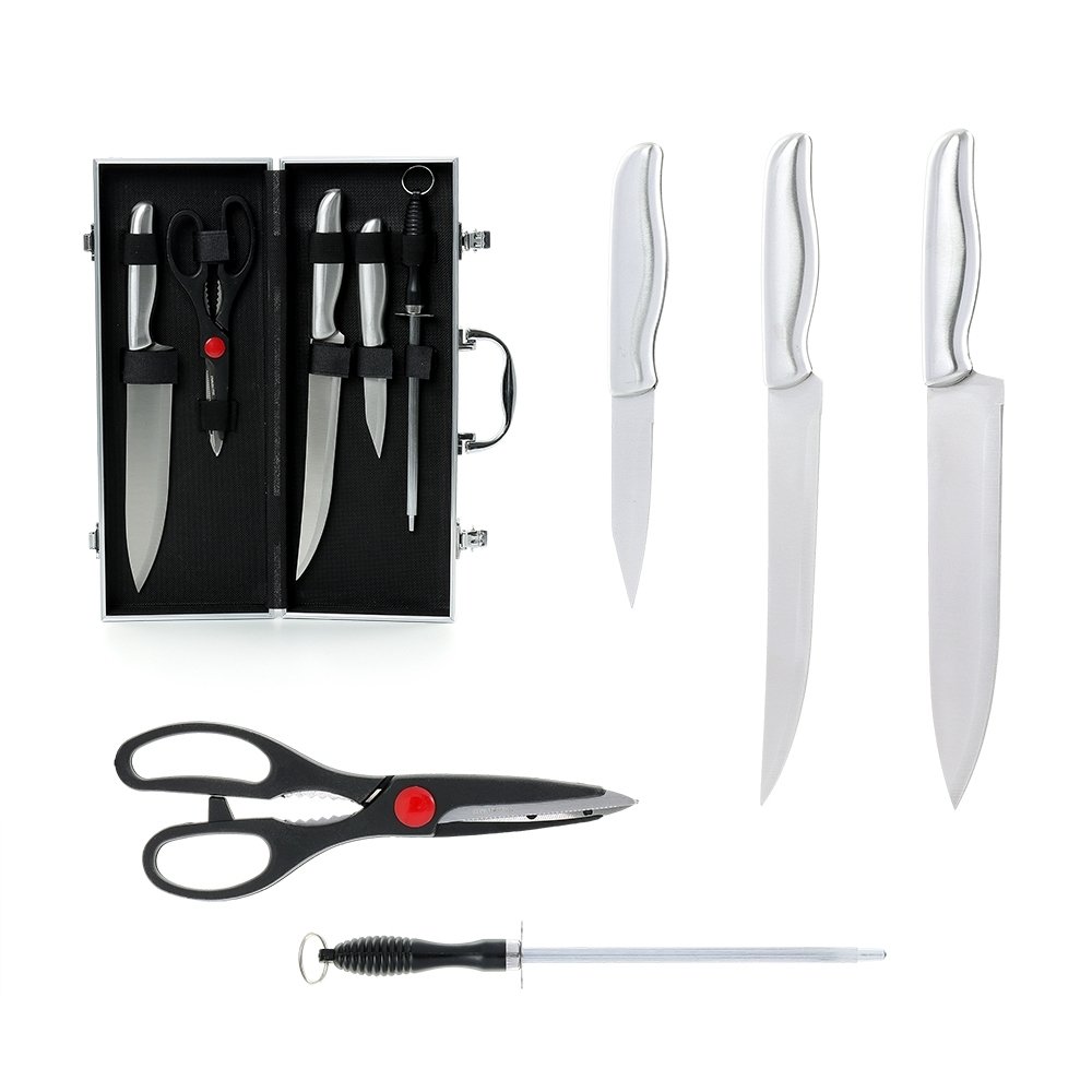 Kit churrasco 5 peças em maleta de alumínio com travas de segurança, contém três facas de corte, tesoura e chaira. Parte interna da maleta com revestimento em tnt e suportes de velcro para fixação das peças.