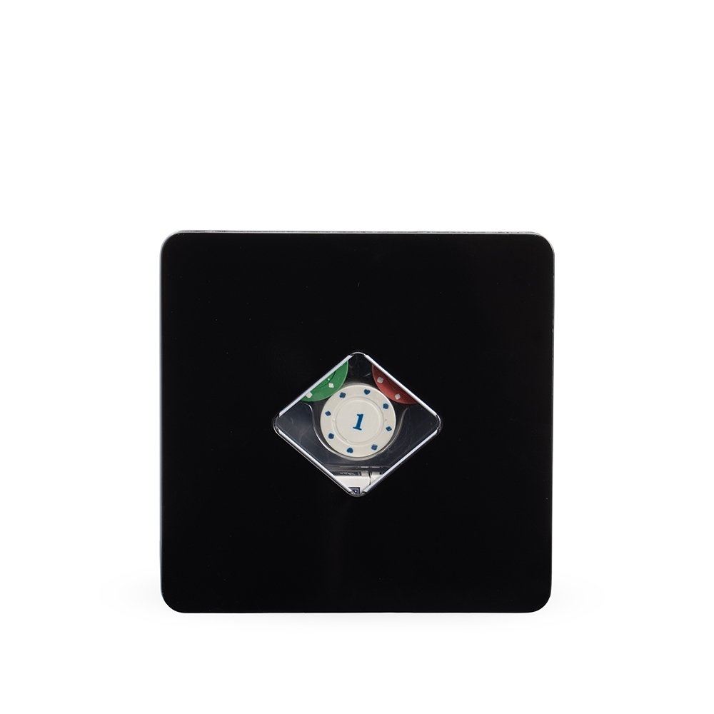 Kit poker personalizado formado por dois baralhos completos, com 54 cartas cada, além de uma ficha de dealer e cerca de 100 fichas coloridas, distribuídas em quatro cores com 25 unidades cada. Acompanha um estojo metálico para guardar os itens do conjunto.