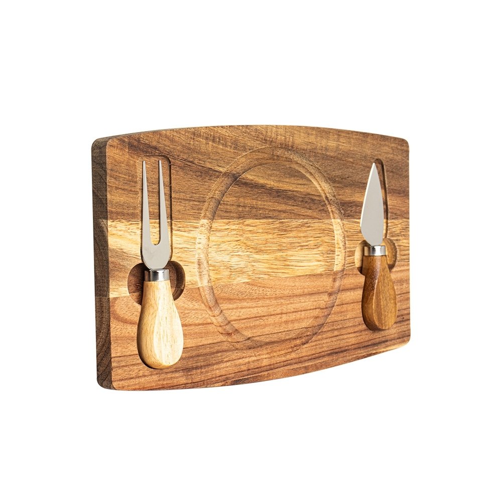 Kit queijo 3 peças, contém: tábua de madeira com canaleta, faca com ponta, e garfo. Tábua com imã para encaixe e fixação dos utensílios.