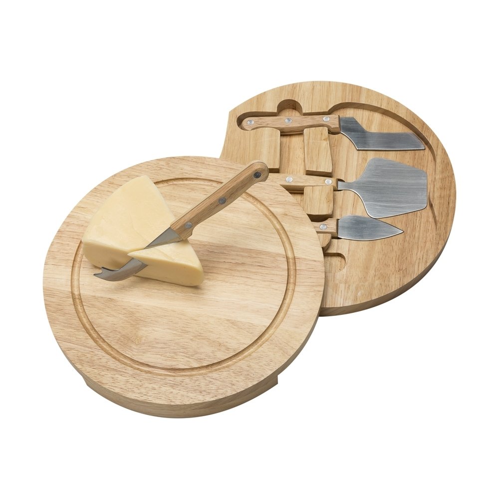 Kit queijo 5 peças, possui tábua de bambu com canaleta e parte inferior com borrachas antideslizantes. Contém faca reta, espátula, faca com ponta e garfo em inox. Para abrir basta rotacionar a tampa.