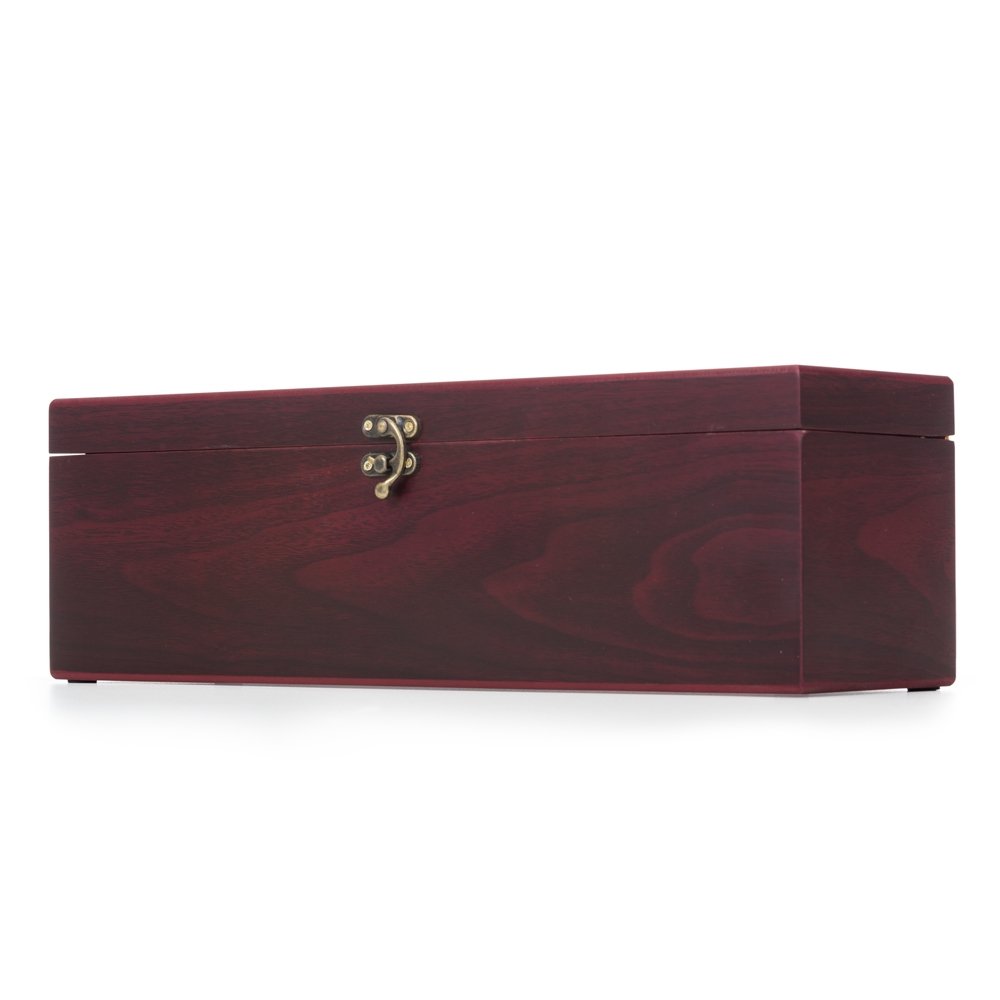 Kit vinho 4 peças em caixa de madeira na cor vinho. Possui: wine collar, bico condutor com tampa, tampa de bico e saca rolha. Parte interna revestida com espuma e tecido vermelho, possui dobradiças douradas e trava metálica, parte inferior com borrachas anti-deslizantes. NÃO ACOMPANHA A GARRAFA DE VINHO