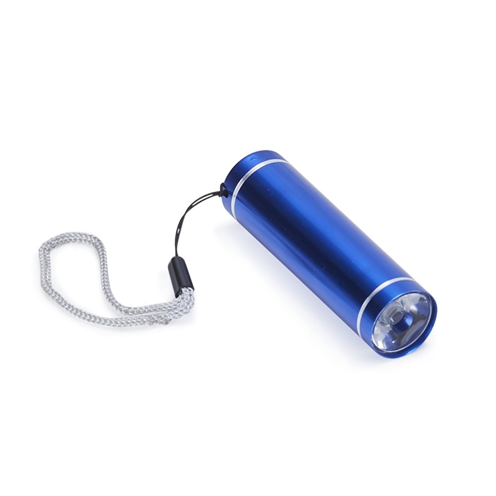 Lanterna de alumínio com 1 led e botão de acionamento emborrachado. Alimentada por 3 pilhas AAA, a lanterna acompanha pilhas de teste e cordão de nylon para transporte.