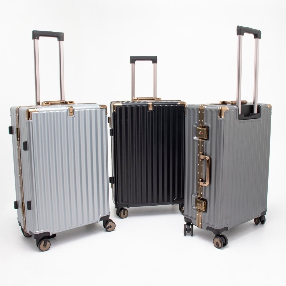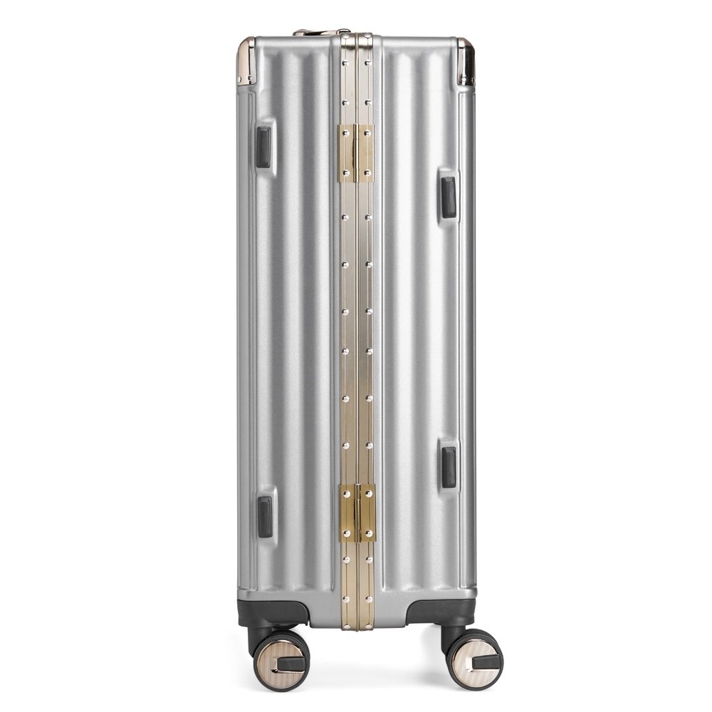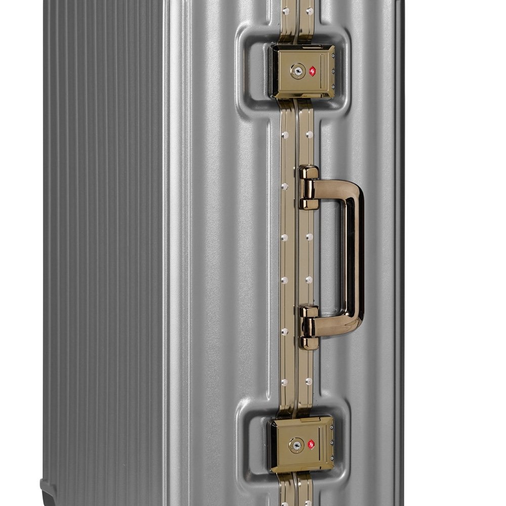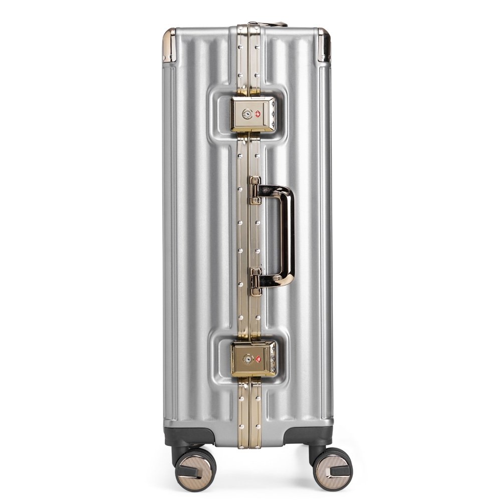 Mala de viagem 64 litros feita em plástico com acabamento em alumínio, contém cadeado numérico TSA. Compartimentos internos com bolso telado, bolso plástico para itens molhados e cinta compressora para roupas. A mala possui duas alças de mãos, puxador retrátil com regulagem de tamanho, suporte porta bolsa, quatro rodinhas 360º e apoios laterais.