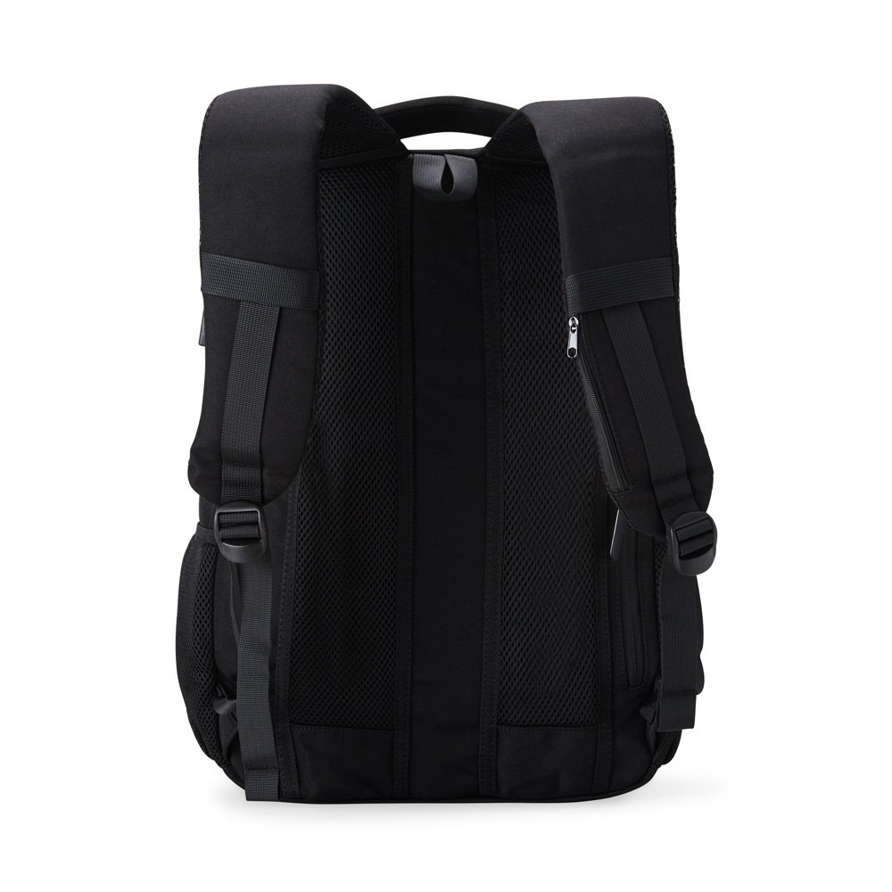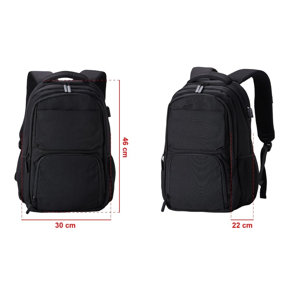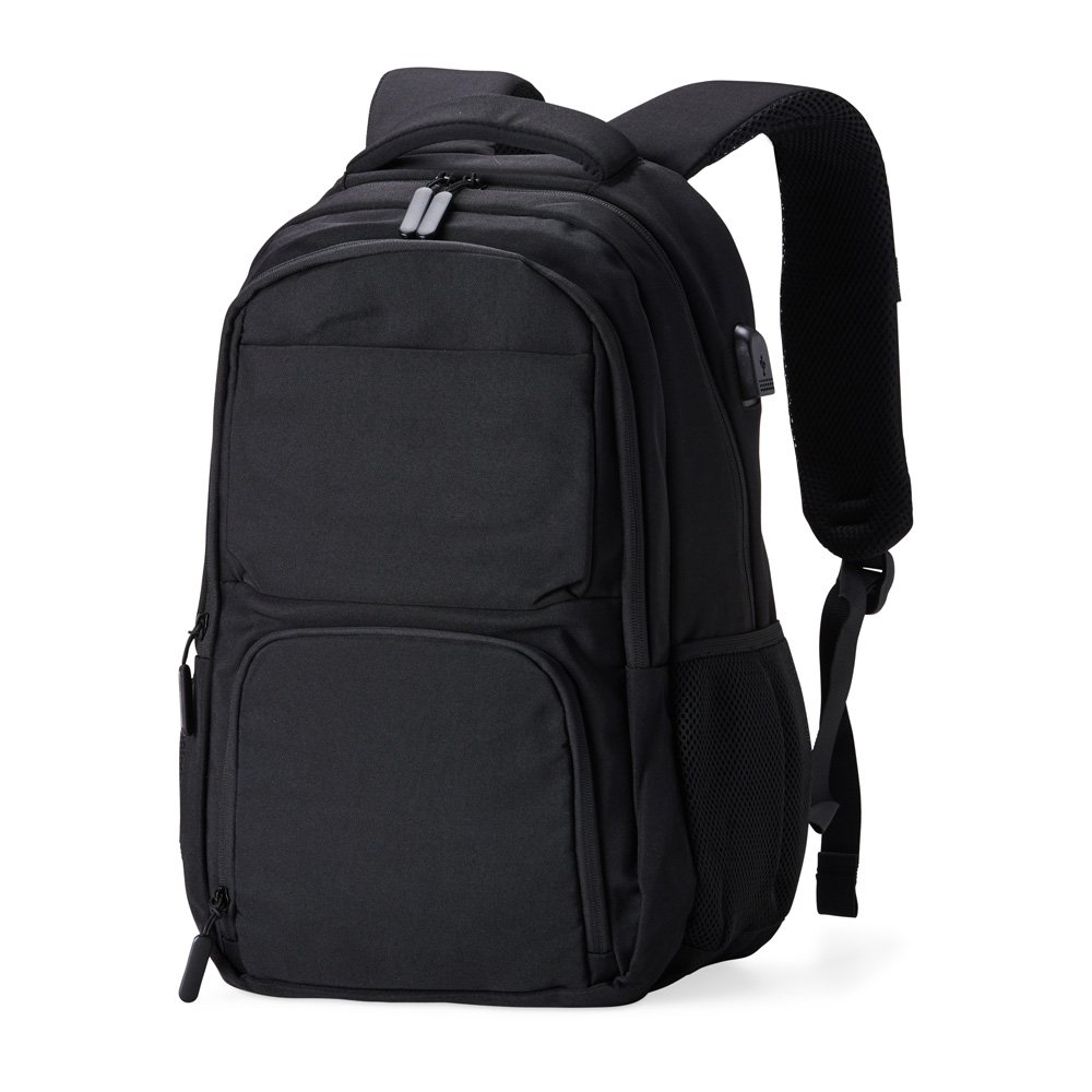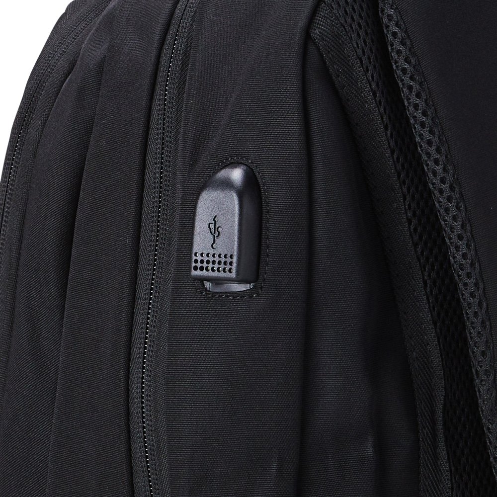 Mochila de poliéster 28 litros com seis compartimentos, sendo o principal com bolso para notebook 15,6 e tablet 12,4. Com divisórias internas para acessórios e porta chave, a mochila possui adaptador USB externo, bolsos laterais telados, duas alças de mãos, área costada e alças para as costas com revestimento espumado.
