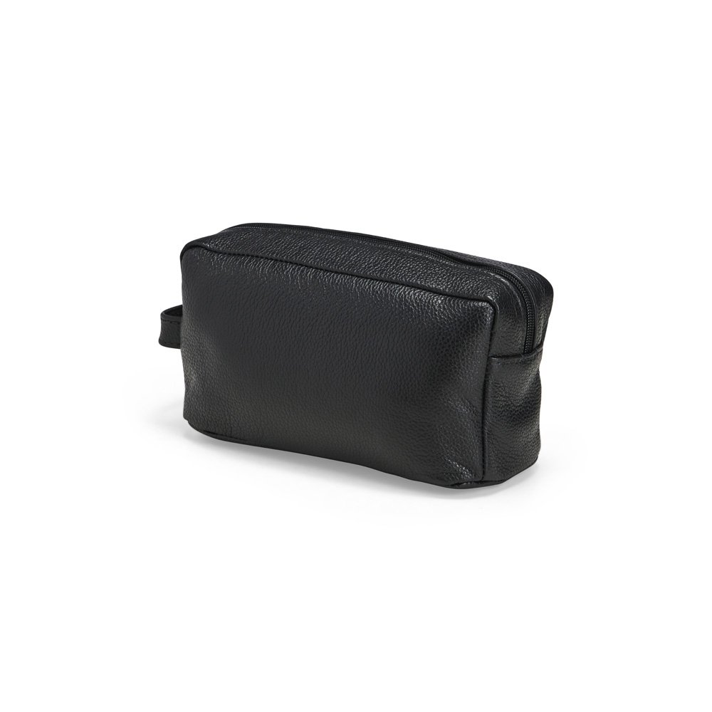 Nécessaire em couro, com fechamento em zíper, alça lateral de mão e plaquinha presa a cordão de nylon.