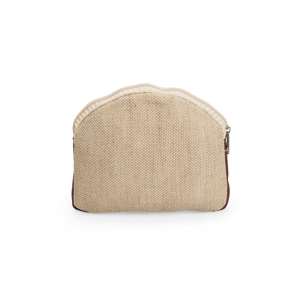 Nécessaire confeccionado em juta com fechamento em zíper e detalhes laterais em bidim.