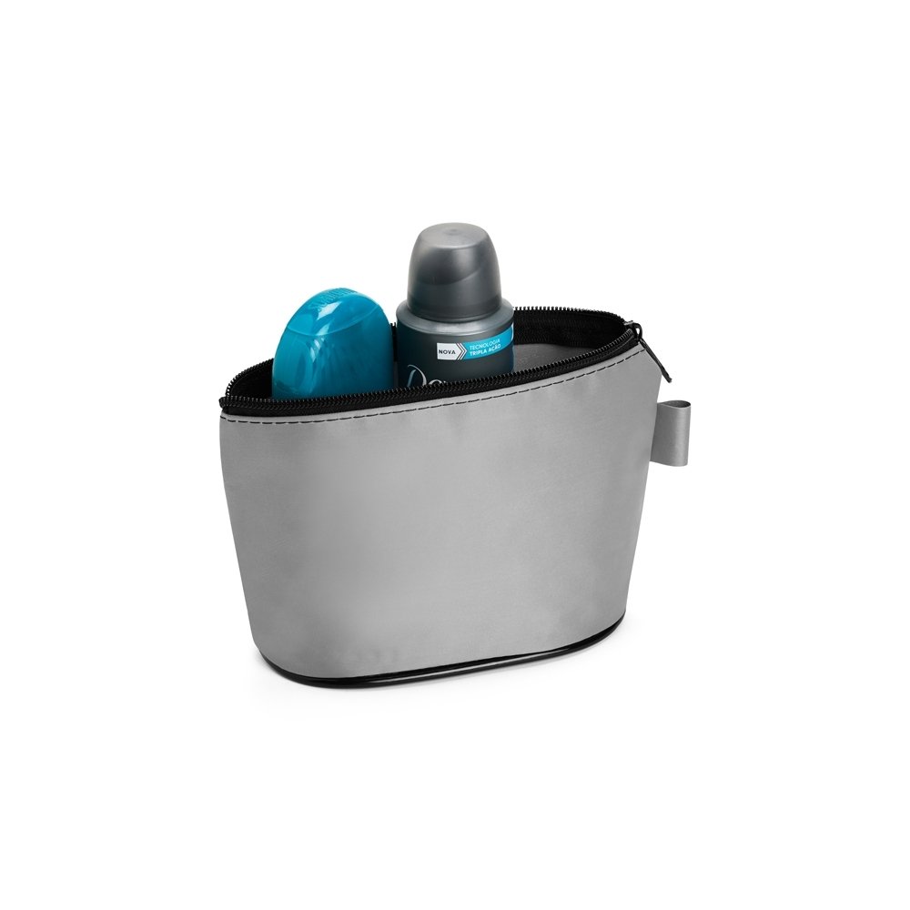 Nécessaire confeccionado em nylon impermeável, fechamento em zíper e alça pequena para acesso de chaveiro ou gancho.