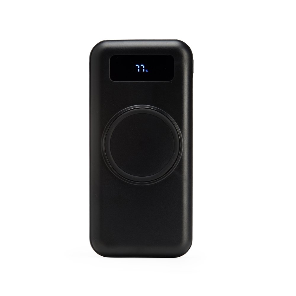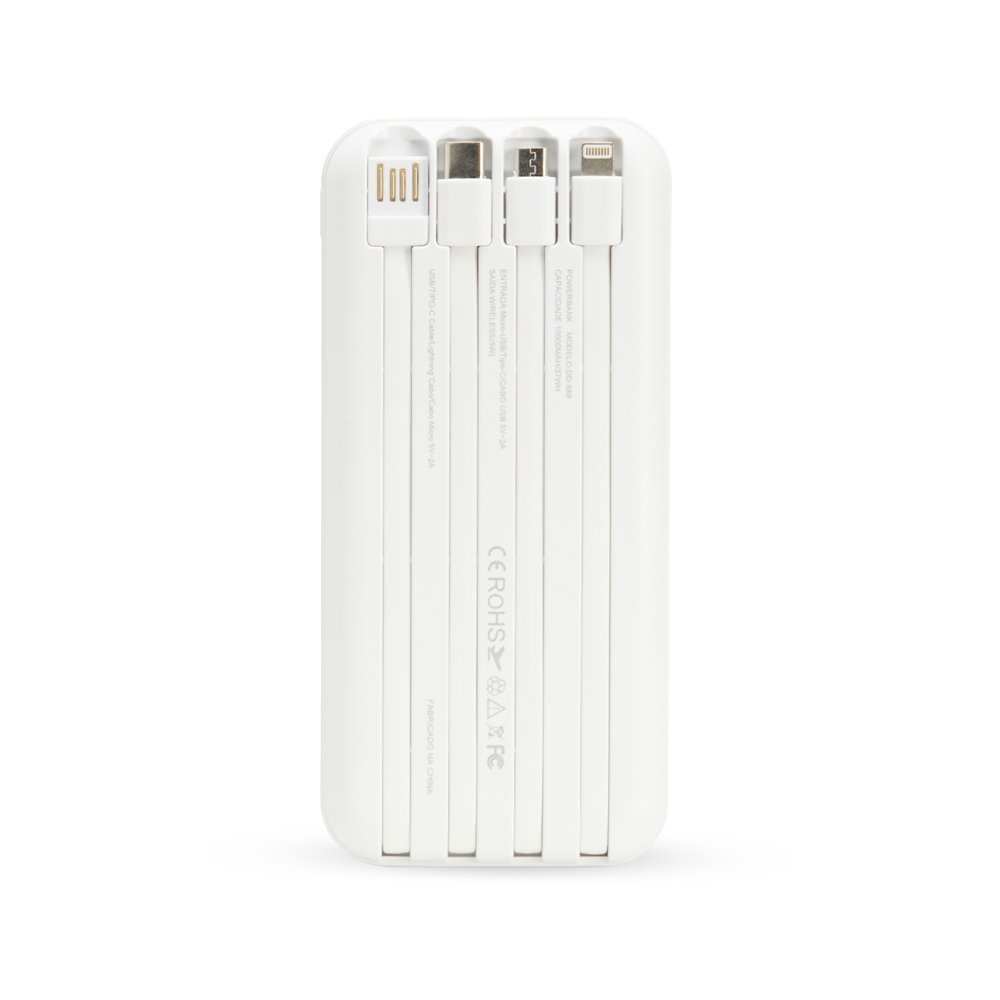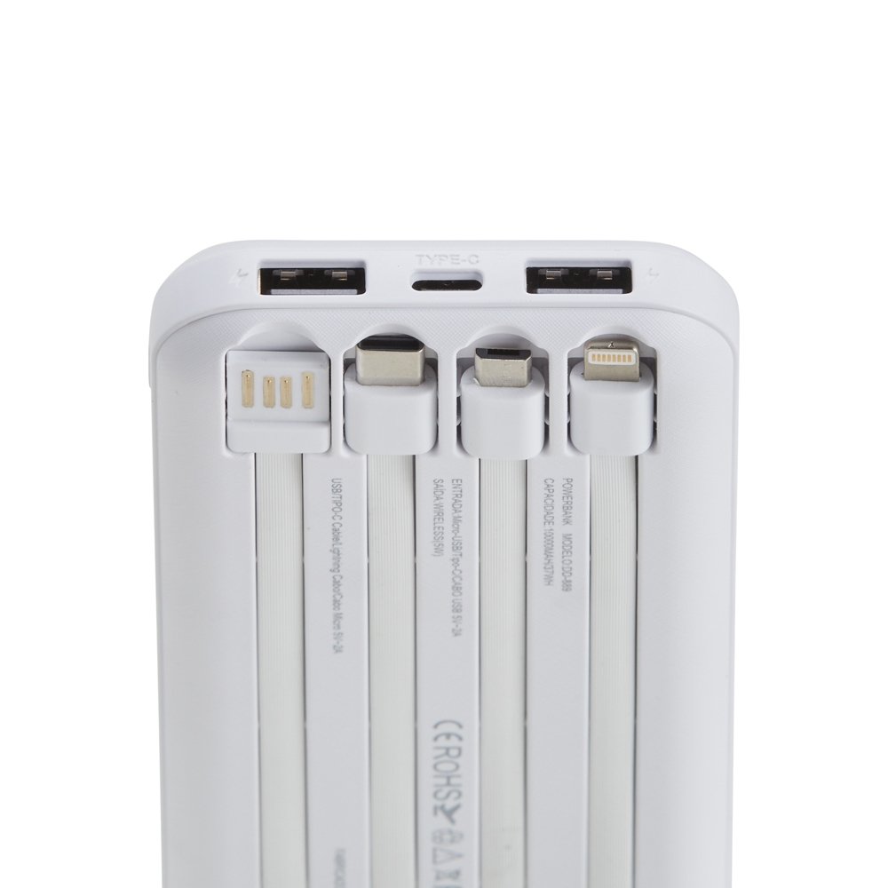 Carregador portátil power bank com 10.000mAh e carregamento via indução ou via cabo. Com display digital indicador de bateria, o carregador contém quatro cabos acoplados: Lightning, Tipo-C, V8 e saída USB para o carregamento da própria bateria. Portas de entrada: V8, Tipo-C e duas portas USB.