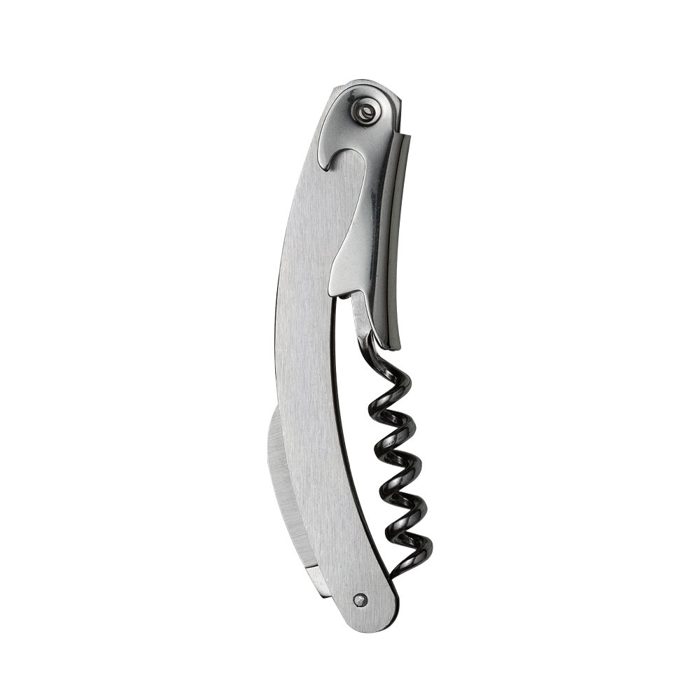Saca-rolhas metálico com lâmina de corte e abridor de garrafa.