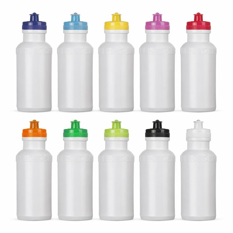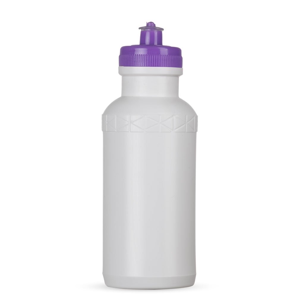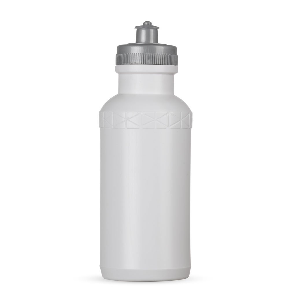 Squeeze 500ml plástico livre de BPA, possui corpo branco com tampa colorida e detalhe em relevo na parte superior. Tampa rosqueável com bico de silicone.