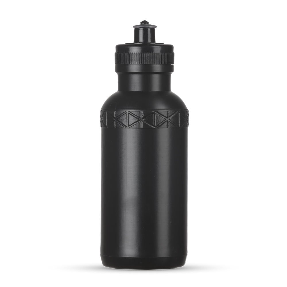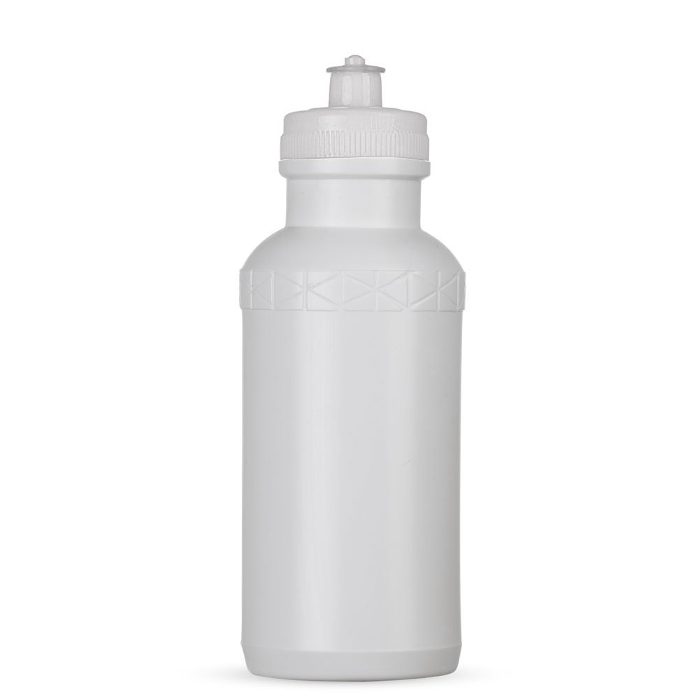Squeeze 500ml plástico livre de BPA, possui detalhe em relevo na parte superior e tampa rosqueável com bico de silicone.