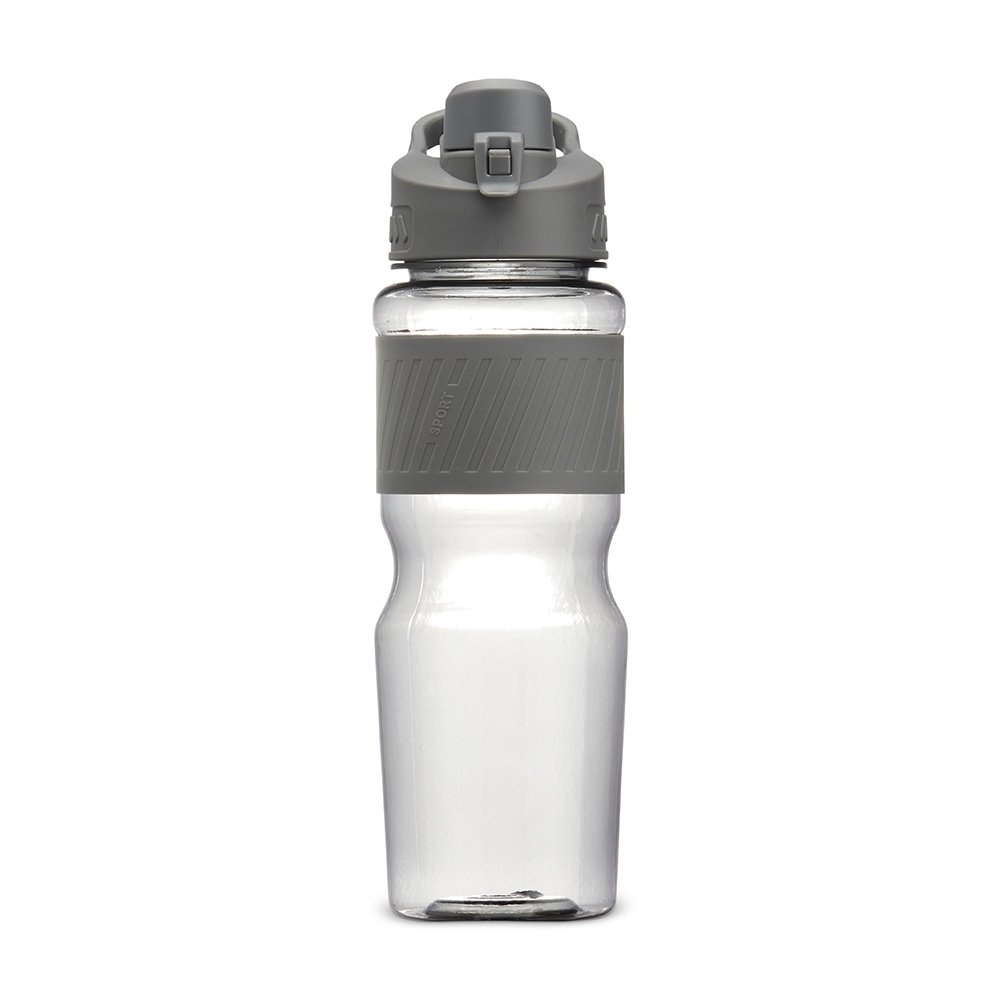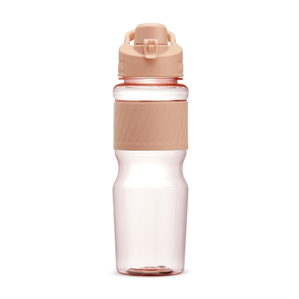 Squeeze plástico com capacidade de 730ml. Possui revestimento emborrachado que facilita a pegada, além de tampa principal rosqueável com alça e tampa adicional com trava de segurança.